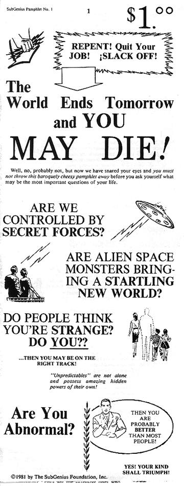 Pamphlet #1 was the first piece of SubGenius propaganda ever published. It was followed up soon after by Pamphlet #2. Its title is "The World Ends Tomorrow and You May Die". You can read it at subgenius.com in HTML format or in PDF format. A print copy comes with SubGenius membership or can be bought cheap, or you could try printing it out yourself (if you're a card-carrying member of the Church of the SubGenius).
